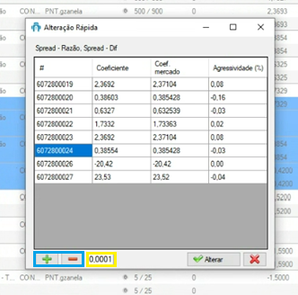 Na tela de Edição Rápida, estará disponível o campo de incremento do coeficiente, destacado em amarelo, além dos botões "+" (mais) e "–" (menos). Esses controles permitem adicionar ou subtrair o valor informado diretamente ao coeficiente das ordens selecionadas.