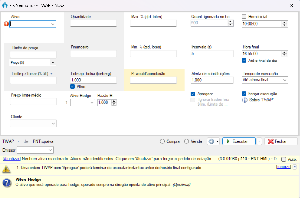 | Hora final | Fim da execução da ordem. | Obrigatório (padrão: final do dia). |