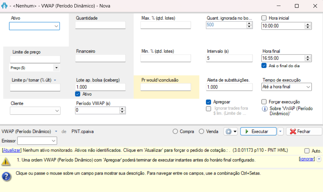 A ordem VWAP (Período Dinâmico) utiliza o valor definido no campo “Período VWAP”, expresso em segundos, para calcular o preço médio ponderado pelo volume dentro desse intervalo configurado.