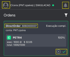Sempre que o assessor ou Mesa da sua corretora inserir uma ordem, uma notificação aparecerá no seu app, indicando que há uma mensagem Push. Clicando no sino vermelho, você poderá aceitar ou rejeitar a ordem.